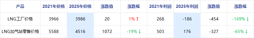 2025年与2021年相比液化天然气工厂价格涨幅1%、利润下降454元/吨,加气站价格降幅19%、利润下降327元/吨。2025年与2021年相比,LNG工厂价格虽有所上涨,但利润大幅下降;LNG零售价格震荡下降,并且利润压缩明显。